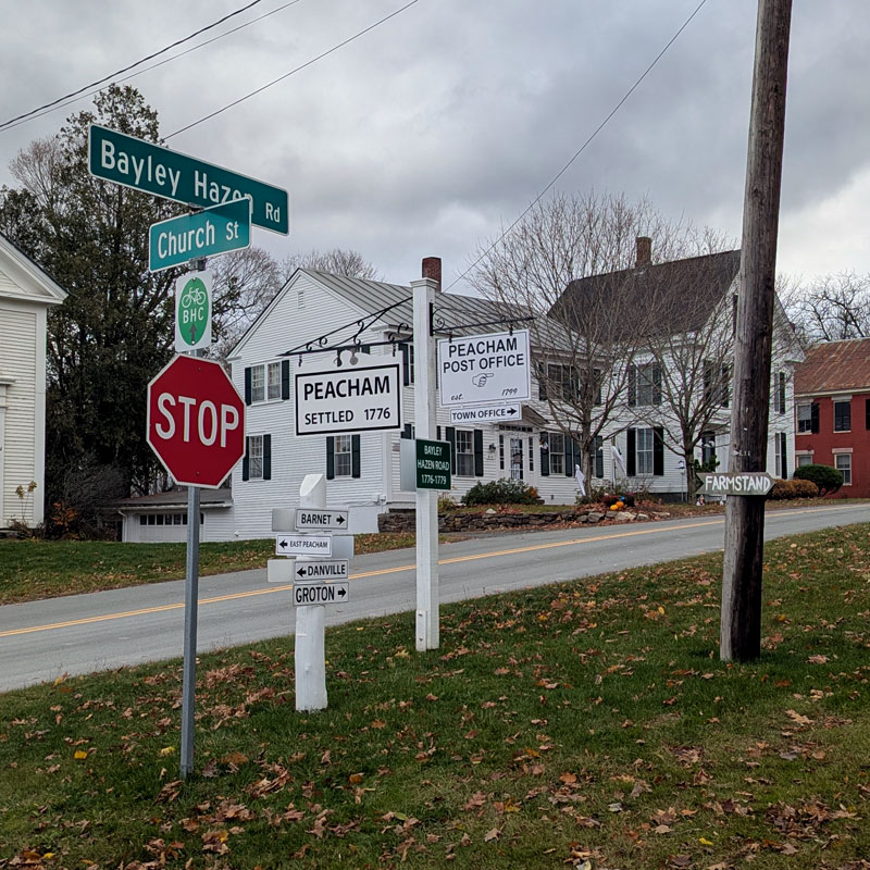 Turn right onto South Main St. Then just before Peacham village the road name changes to Bayley-Hazen Rd again, continue straight through the village.