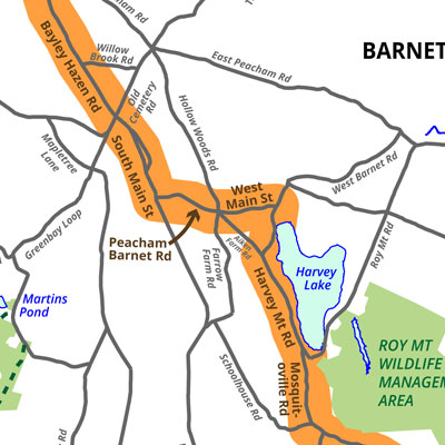 Just north of Harvey Lake, turn left onto West Main St. Which name changes to Peacham-Barnet Rd at the Peacham town line.