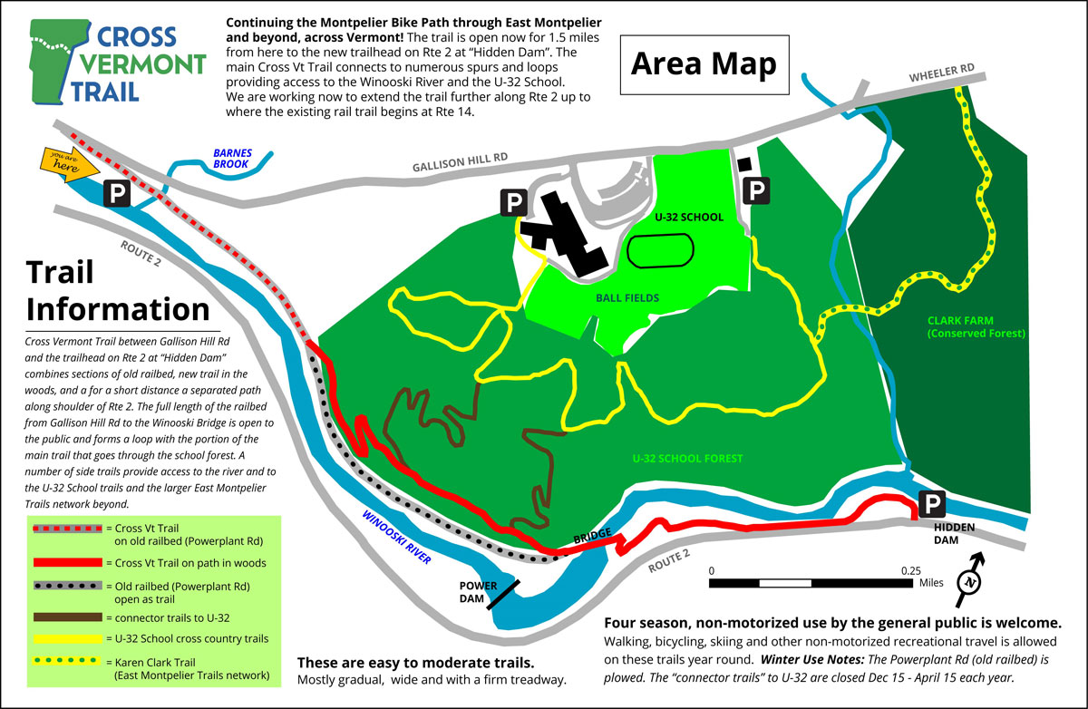 This fall we completed the smooth gravel surfacing of the Cross Vermont Trail segment in the U-32 School Forest (west of the Winooski Bridge, uphill from the old railbed and the hydro dam.) The trail is open through the winter, but not maintained for winter use (we don't groom or plow.) The old railbed is also open to the public all the way out to the bridge, and always will be.